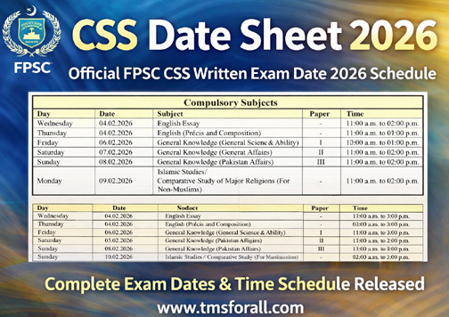 The Federal Public Service Commission (FPSC) uploaded the CSS Date Sheet 2026 on its official website, https://www.fpsc.gov.pk/, on January 9, 2026, for the Competitive Examination (CSS) 2026. The CSS written exam 2026 will commence on Wednesday, 4th February 2026, and will continue till Sunday, 15th February 2026. Thousands of aspirants will appear in this examination to join Pakistan’s top civil services.