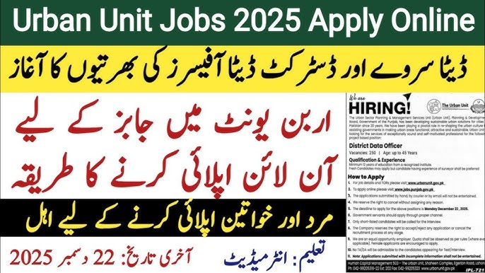 The Urban Unit has announced 250 District Data Officer Jobs 2025. This is a golden opportunity for people with at least 12 years of education. The urban unit is working under the Planning & Development Board, Government of Punjab. Besides 250 District Data Officer Jobs 2025, there are many other jobs, including Research Analyst Environment, Research Associate SWM, and Surveyor positions. The last date to submit the online application is December 22, 2025.
