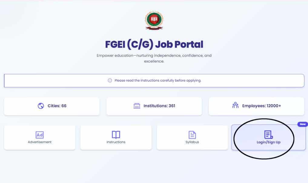 STEP 1: The application process for FGEI jobs 2025 is very simple and can be applied for online. Visit the induction.fgei-cg.gov.pk for the submission of an online application.  Last date to apply is 23rd September 2025.