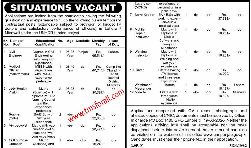 Applications are invited from the candidates having the following qualification and experience to fill up the following purely temporary contractual posts (extendable subject to provision of budget by donors and satisfactory performance of officials) in Lahore / Mianwali under the UNHCR funded project