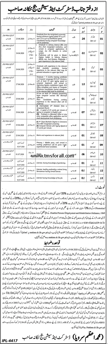 Applications Are Invited For The Office Of District And Session Judge Nankana Sahib Of 63 Different Posts