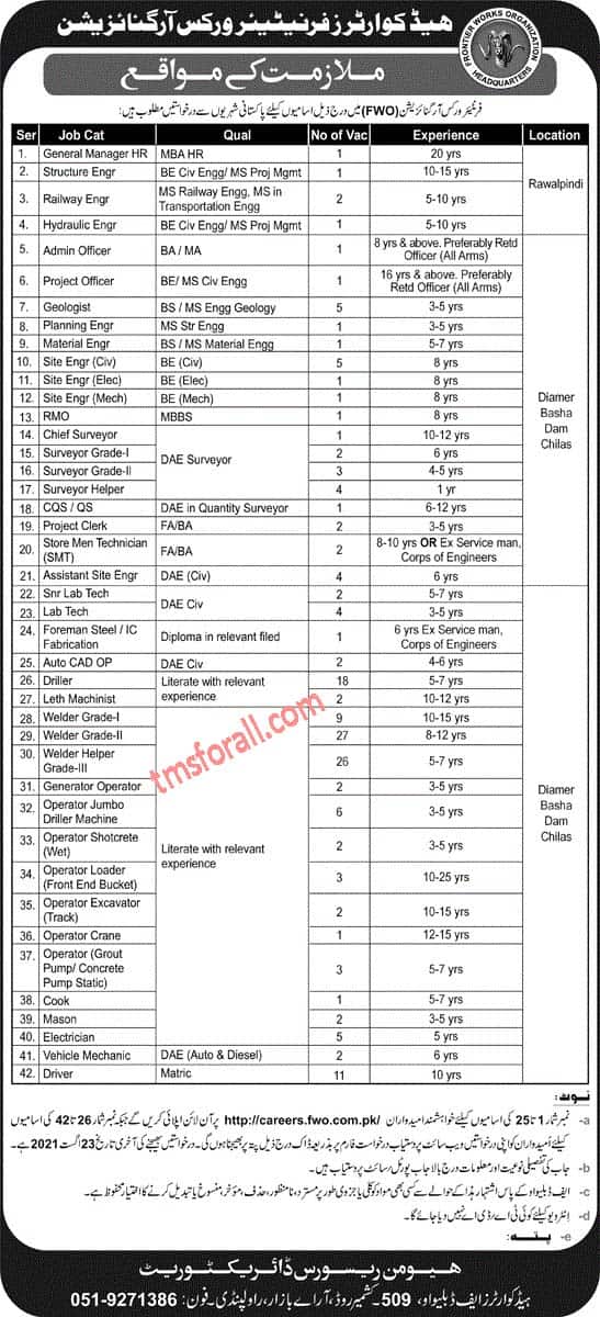 FWO August Jobs 2021:Multiple Jobs of different categories are announced in Frontier Works Organization Headquarter and applications are invited from qualified and experienced Pakistanis Nationals. Interested individuals can apply Online and through courier till 23rd August 2021. The detail about these jobs is given below