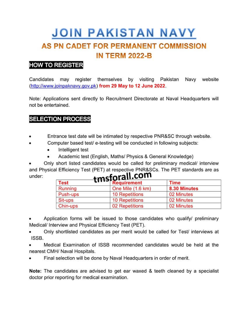Join Pakistan Navy As PN Cadet For Permanent Commission Term 2022-B. If you looking for these jobs, it is a great opportunity for you to become the part of Pakistan Navy as PN Cadet for Permanent Commission. Only unmarried male candidates from all over Pakistan are eligible to apply. Females (Girls) are not eligible to apply for PN Cadet Term 2022-B. The registration process starts from today(29 May 2022) and it will continue till June 12, 2022.