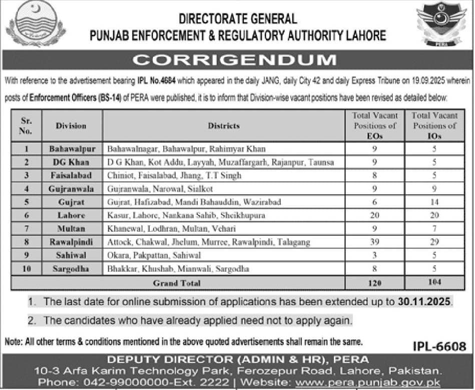 With reference to the advertisement bearing IPL No. 4684 which appeared in the daily JANG, daily City 42 and daily Express Tribune on 19.09.2025, wherein posts of Enforcement Officers (BS-14) of PERA were published, it is to inform that Division-wise vacant positions have been revised as detailed below:
