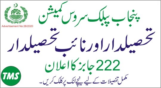 PPSC Advertisement No 28/2020: Punjab Public Service Commission(PPSC) 222 jobs of Tehsildar And Naib Tehsildar on regular basis in Punjab Board Of Revenue Department and applications are invited from suitable candidates from the Punjab province. All detail of these jobs is given below.